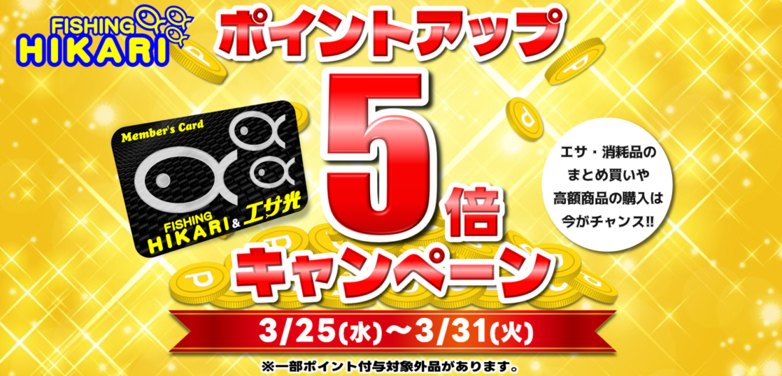 通常の割引セールでは対象外のエサ類もポイント5倍の対象となりますので、この期間のご購入がお得なチャンスですよ‼