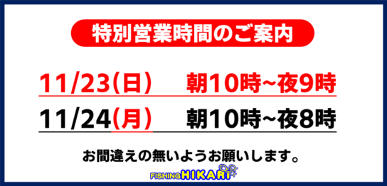 11/22(土)より通常営業時間が変更となります。 ご来店の際はお間違えの無いよ